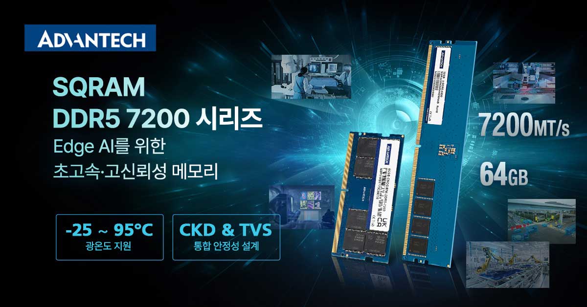 타이베이, 2026년 3월 31일 – IoT 지능형 시스템 및 임베디드 플랫폼 분야의 글로벌 선도기업 어드밴텍(Advantech, TWSE: 2395)은 자사의 SQRAM DDR5 7200MT/s 산업용 메모리 모듈 시리즈를 확대한다고 오늘 발표했습니다. 새롭게 출시된 모듈은 Edge AI(엣지 AI)의 급증하는 데이터 처리 수요에 대응하도록 설계됐으며, 이전 세대 대비 12.5% 향상된 성능과 모듈당 최대 64GB의 획기적인 용량을 제공합니다. 이를 통해 옥외 환경에서도 더욱 높은 안정성과 확장성을 구현하며, 새로운 기준을 제시합니다.